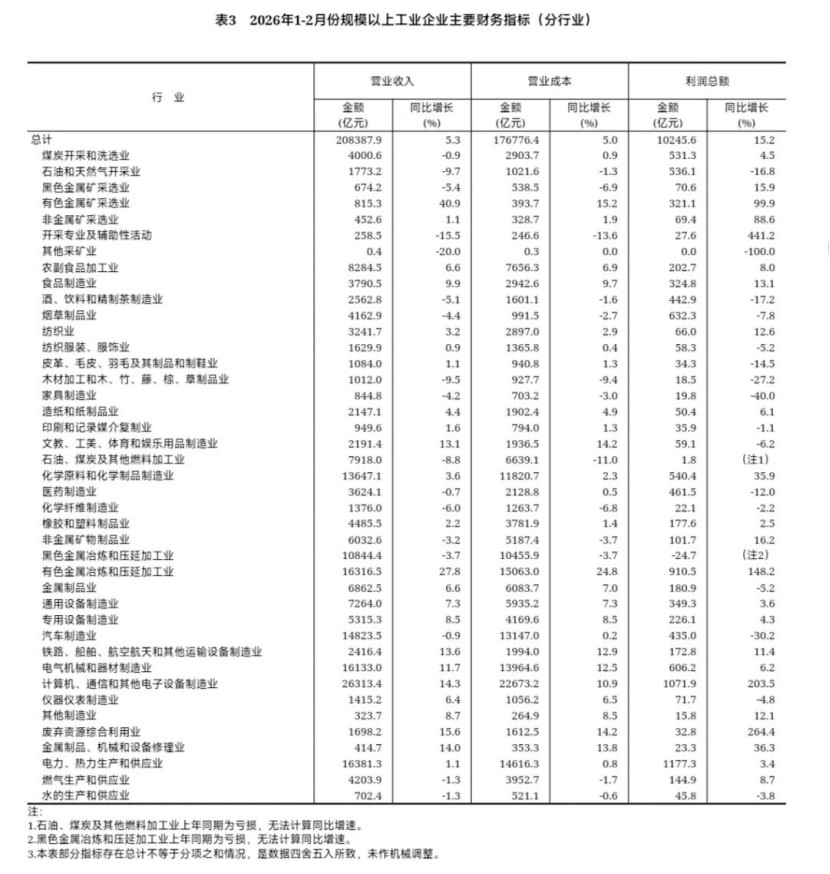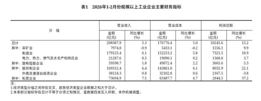 1—2月份,全國規模以上工業企業實現利潤總額10245.6億元,同比增長15.2%(按可比口徑計算,詳見附注二)。