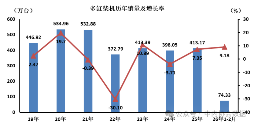 據(jù)中國內(nèi)燃機(jī)工業(yè)協(xié)會(huì)統(tǒng)計(jì),2026年2月,多缸柴油內(nèi)燃機(jī)銷售31.74萬臺(tái),環(huán)比增長-25.48%,同比增長-7.30%;1-2月銷量74.33萬臺(tái),同比增長9.18%。銷量靠前的企業(yè)為濰柴、玉柴、全柴、云內(nèi)、一拖、東風(fēng)康明斯、新柴、新動(dòng)力科技、解放動(dòng)力、蜂巢動(dòng)力。