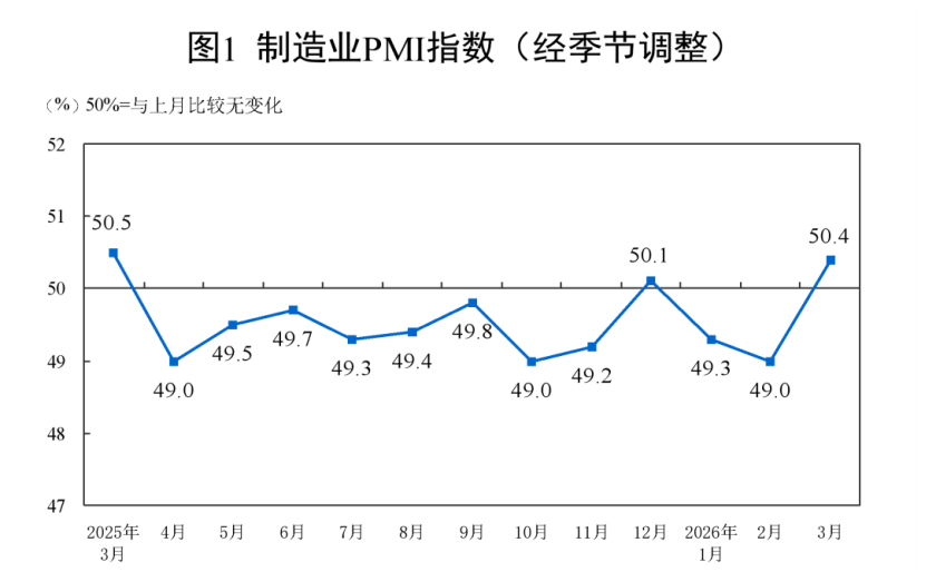 3月份,制造業采購經理指數(PMI)為50.4%,比上月上升1.4個百分點,高于臨界點,制造業景氣水平回升。