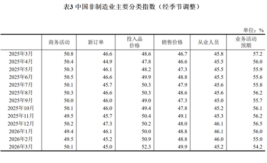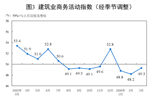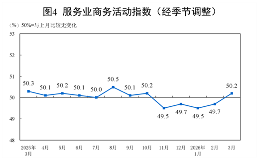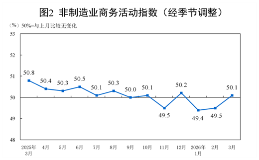 3月份,非制造業商務活動指數為50.1%,比上月上升0.6個百分點,高于臨界點,非制造業景氣水平有所改善。