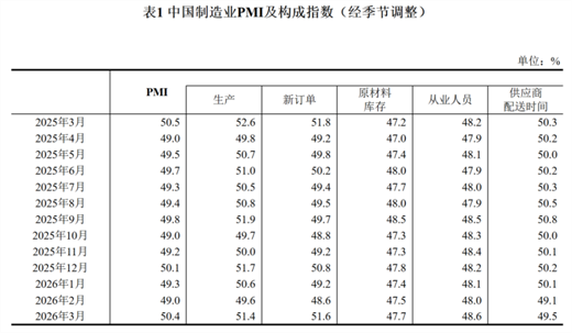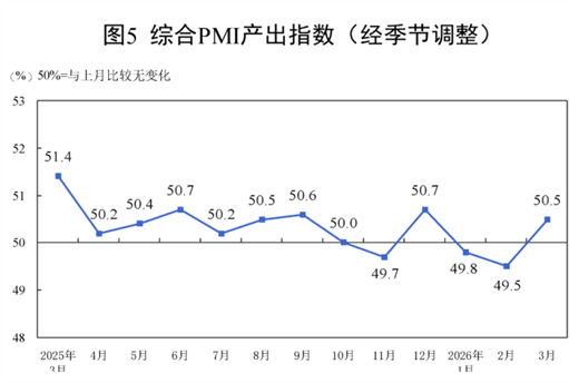 3月份,綜合PMI產出指數為50.5%,比上月上升1.0個百分點,高于臨界點,表明我國企業生產經營景氣水平總體向好。