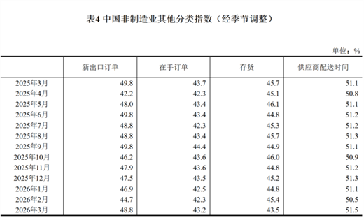 供應商配送時間指數為49.5%,比上月上升0.4個百分點,低于臨界點,表明制造業原材料供應商交貨時間較上月延長。