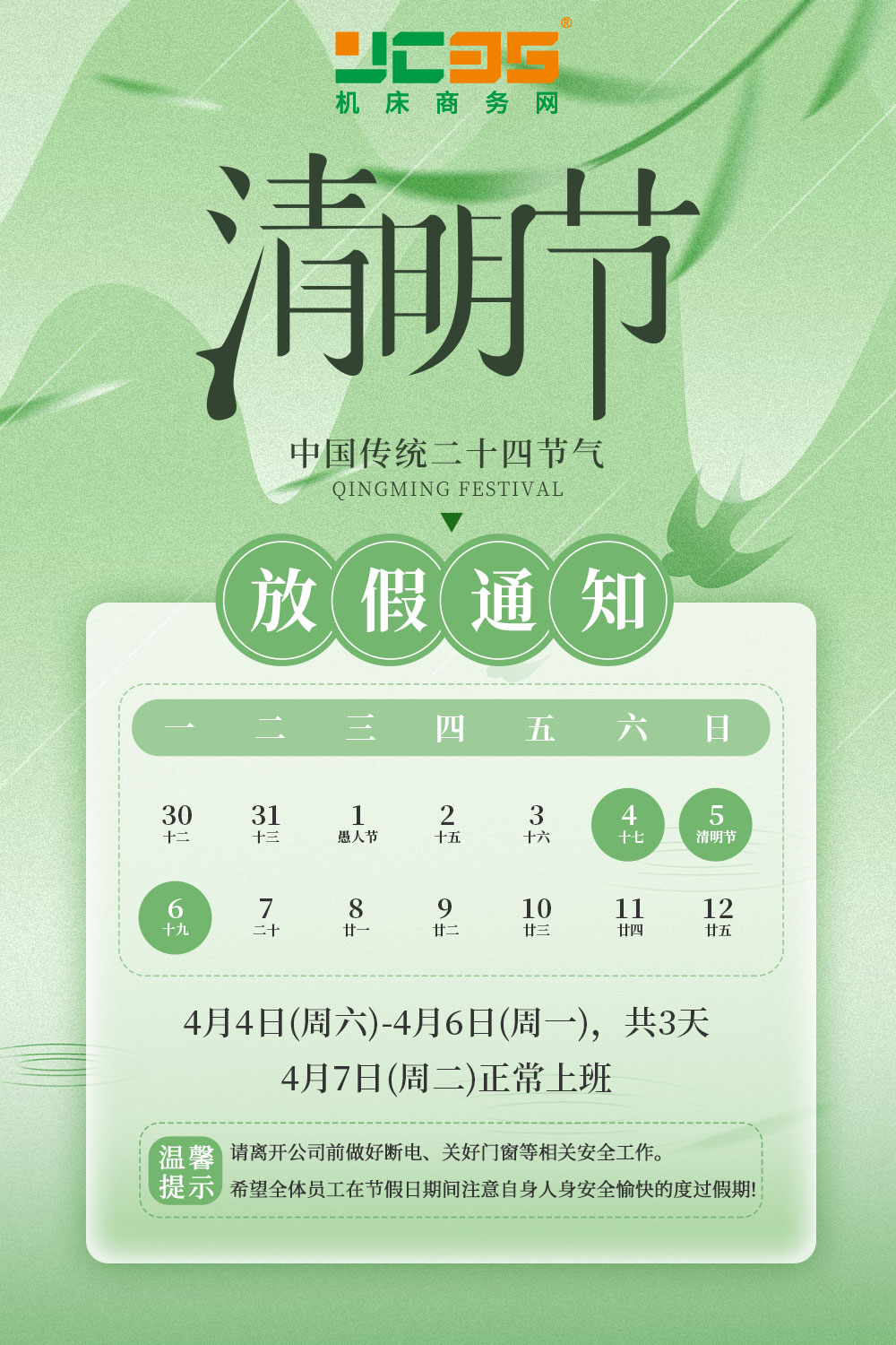 2026年4月7日(星期二)全員正常上班,恢復全流程業務對接。