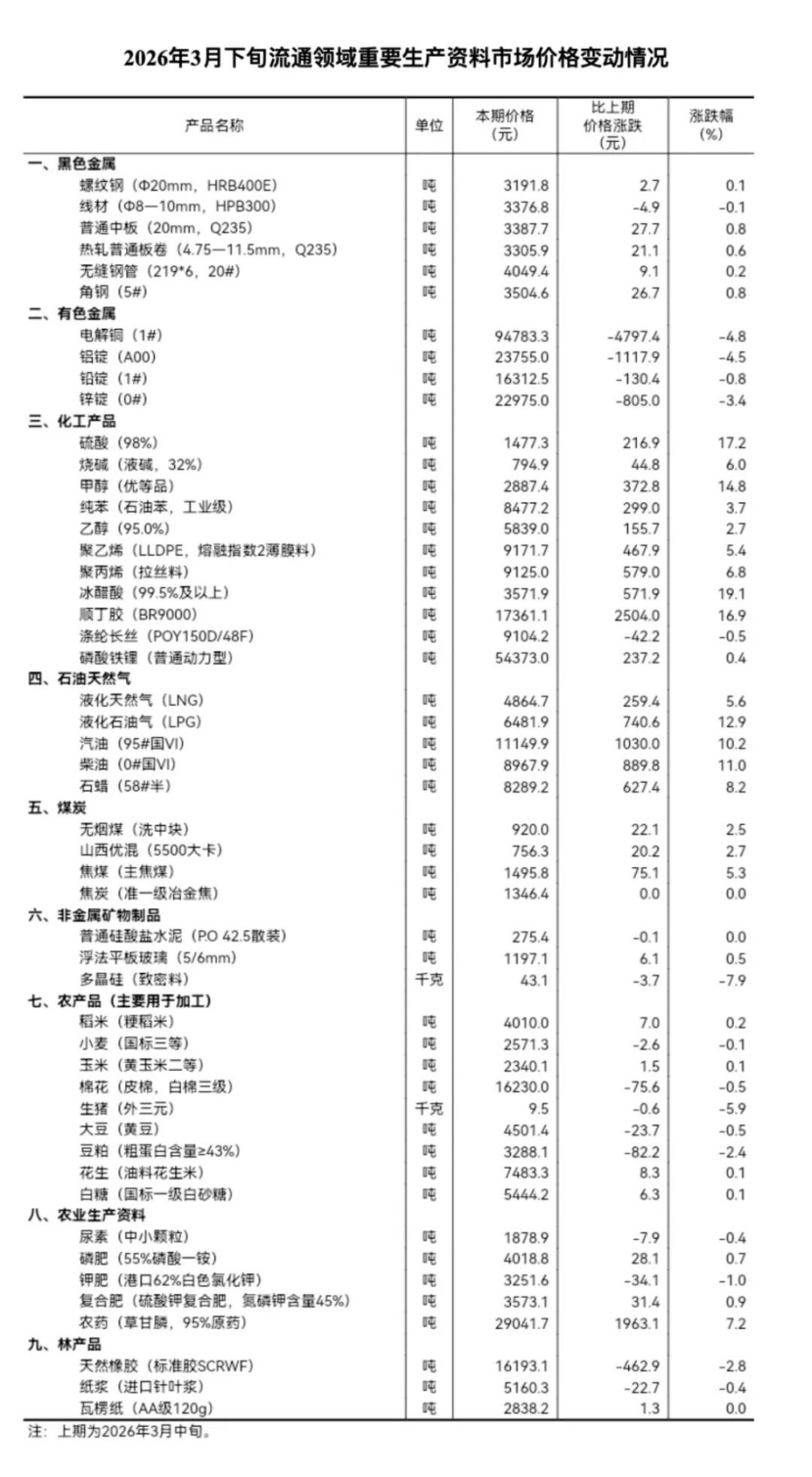 據對全國流通領域9大類50種重要生產資料市場價格的監測顯示,2026年3月下旬與3月中旬相比,31種產品價格上漲,16種下降,3種持平。