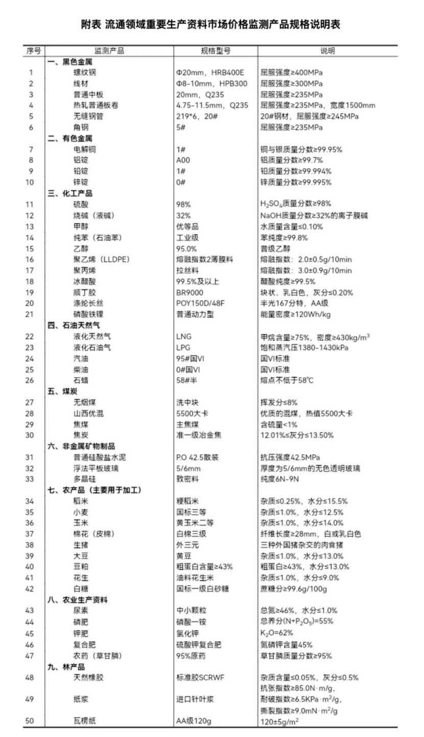 流通領域重要生產資料市場價格監測內容包括9大類50種產品的價格。類別與產品規格說明詳見附表。