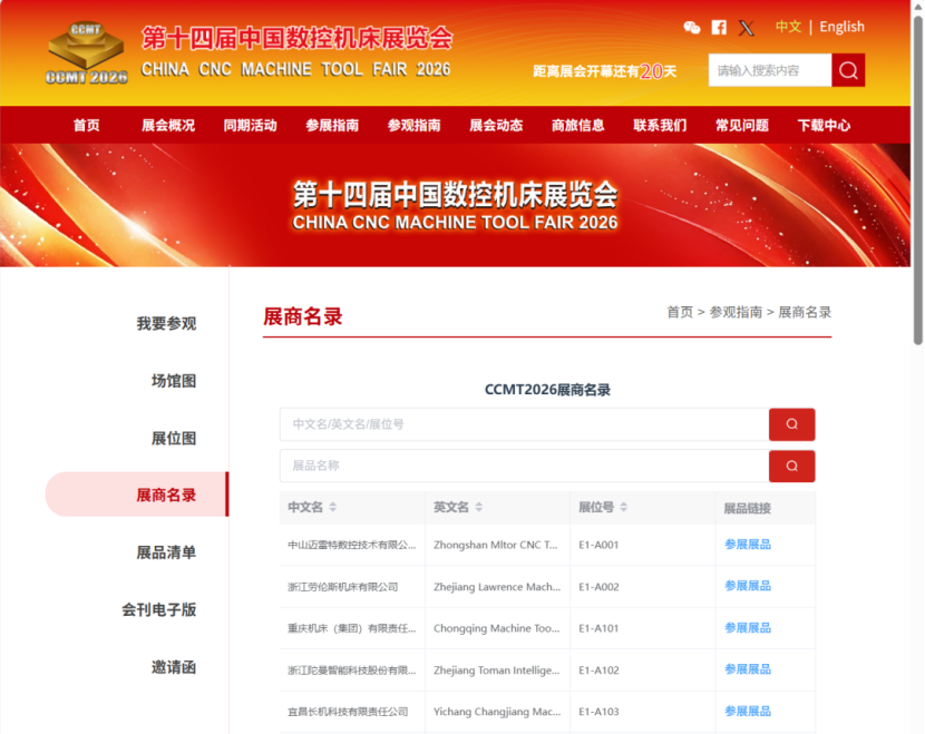 【機床商務網欄目 展會預告】距CCMT2026(第十四屆中國數控機床展覽會)開幕還有20天時間,主承辦方、各合作單位及廣大展商都在緊鑼密鼓地進行展會籌備工作。為了觀眾們更好地規劃參觀路線,主辦方已將展會全部17個室內展館和一個臨時展館的展位圖全部上線發布,同時發布的還有全部展商名錄。