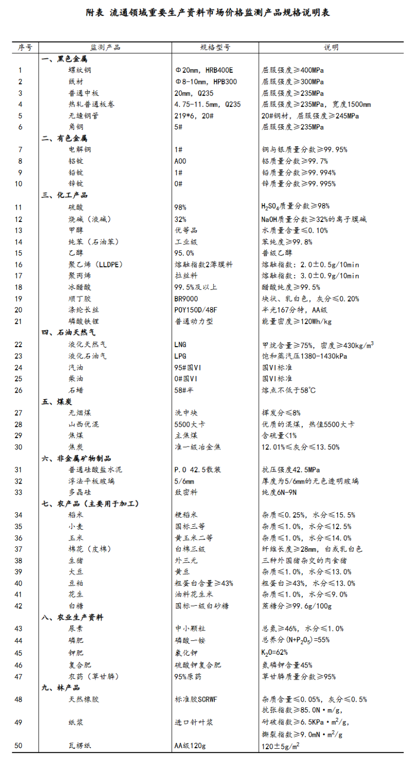 流通領域重要生產資料市場價格監測內容包括9大類50種產品的價格。類別與產品規格說明詳見附表。